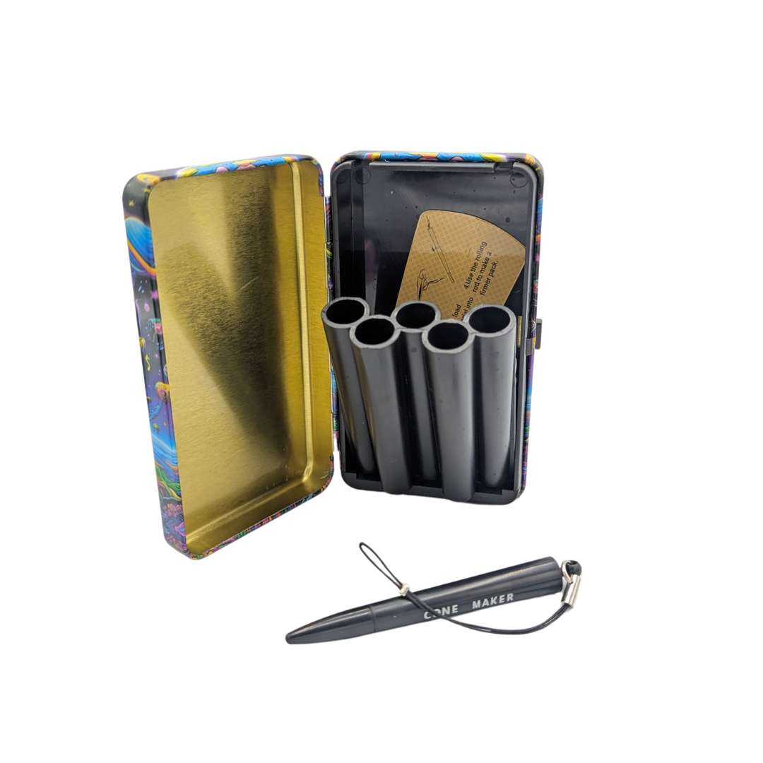 La cajetilla porta conos metálica es el accesorio ideal para quienes buscan transportar sus conos de forma segura, organizada y discreta. Con unas dimensiones de 10.8 cm de alto y 6.4 cm de ancho, ofrece el tamaño perfecto para llevar en el bolsillo o mochila.