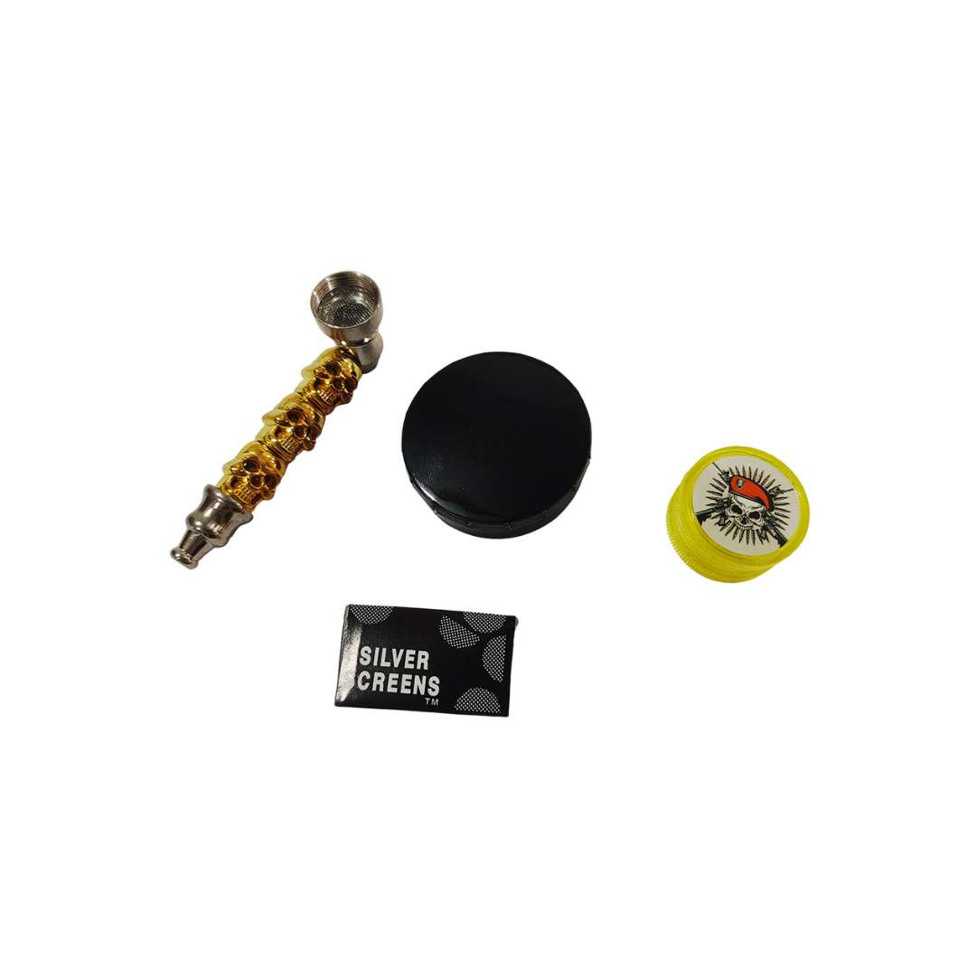 Este kit de pipa metálica con accesorios es una excelente opción para quienes buscan un set completo y práctico. Incluye una pipa metálica de 8 cm, un grinder acrílico de 30 mm, mallas metálicas de repuesto y un contenedor de 4.5 cm, todo presentado en una elegante caja.