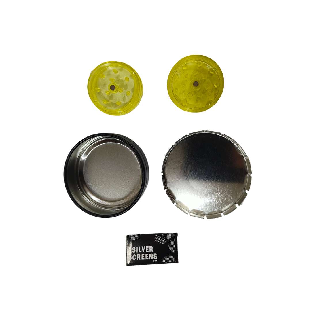Incluye una pipa metálica de 8 cm, grinder acrílico de 30 mm, mallas metálicas de repuesto y un contenedor de 4.5 cm.