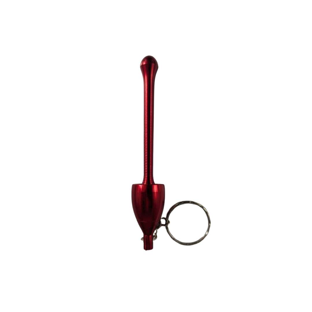 Fabricada en metal resistente, esta pipa ofrece durabilidad y un diseño elegante. Su estructura alargada permite un uso cómodo, mientras que el sistema de llavero facilita tenerla siempre a mano.